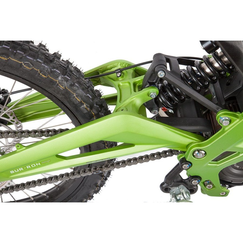 Электропитбайк SUR RON X в зелёной расцветке создан для быстрой езды по дорогам. Он спокойно проедет по грунтовой дороге, не застрянет в песке и ему не страшны горки.