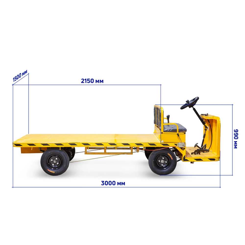 Грузовая платформа: Пространство 2150×1500×300 мм подходит для паллетов, ящиков, мешков. Крюки по периметру надёжно фиксируют груз. Несъёмные борта 300 мм, усиленная стальная конструкция.
