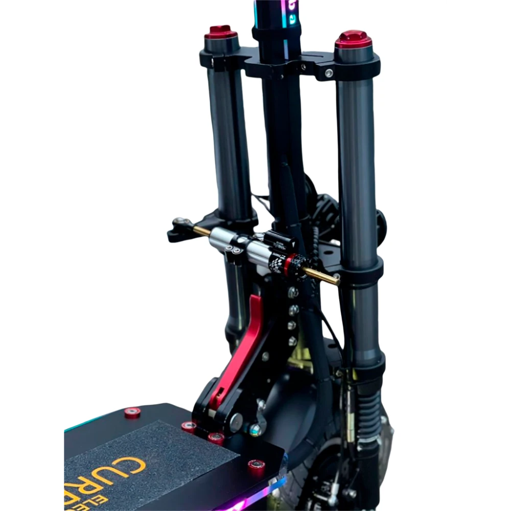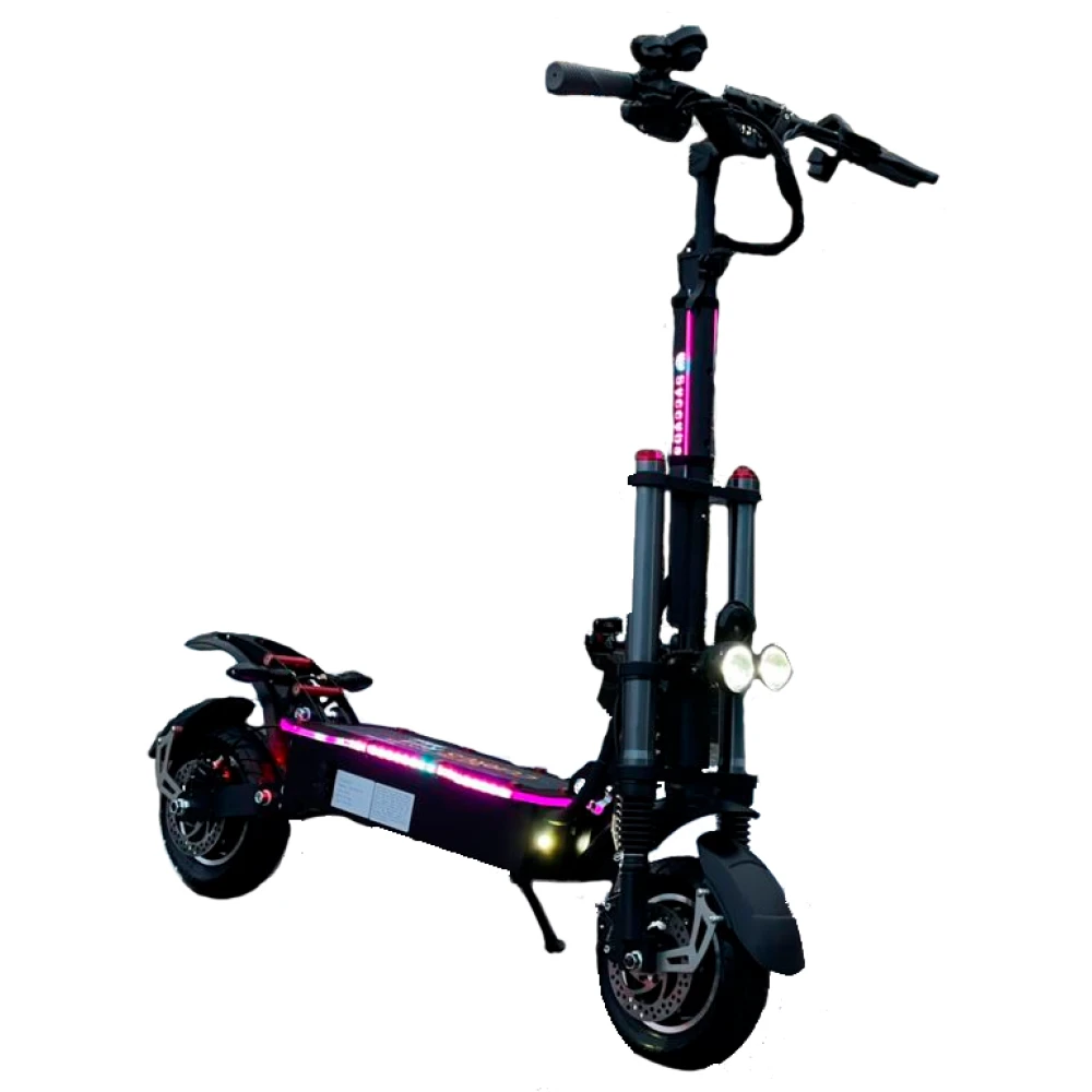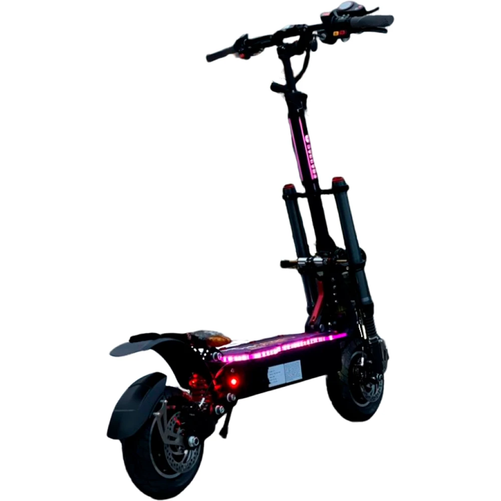 Модель представлена шикарным дизайном, рассчитана на грузоподъемность до 120 кг. При мощности двигателя 2400 Вт модель способна развивать космическую скорость – до 70 км/час и преодолевать 50 км пути. Наличие передних светодиодных фар и подсветки допускает эксплуатацию электросамоката в вечернее время. Колесная часть мощная, надувная. Характеристики электросамоката рассчитаны на уверенных в собственных возможностях подростков и взрослых пользователей.