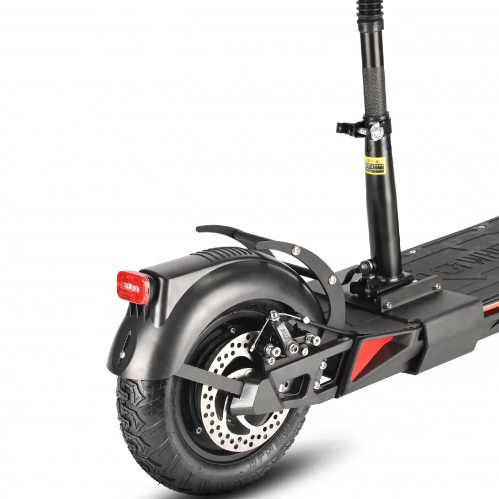 Алюминиевый сплав - это материал электросамоката, он легкий и прочный, в связи с чем его вес всего 23 килограмма, а на борт можно подняться с предельной массой в 125 килограмм. Вы сможете не только самостоятельно кататься, но и перевозить любые вещи, положив их с собой. Электромотор самоката позволит вам достигнуть максимальной скорости в 45 км/ч. Задний привод и надувные колеса с диаметром в 11 дюймов позволят вам передвигаться с максимальным комфортом и чувством защищенности.